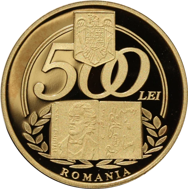 Romania's coat-of-arms overlaps the "leu 500" face value above an open book on a laurel wreath. The book displays Eminescu's 1869 portrait and his signatures, all within a partial double circle. "ROMANIA" is engraved along the lower outer edge.