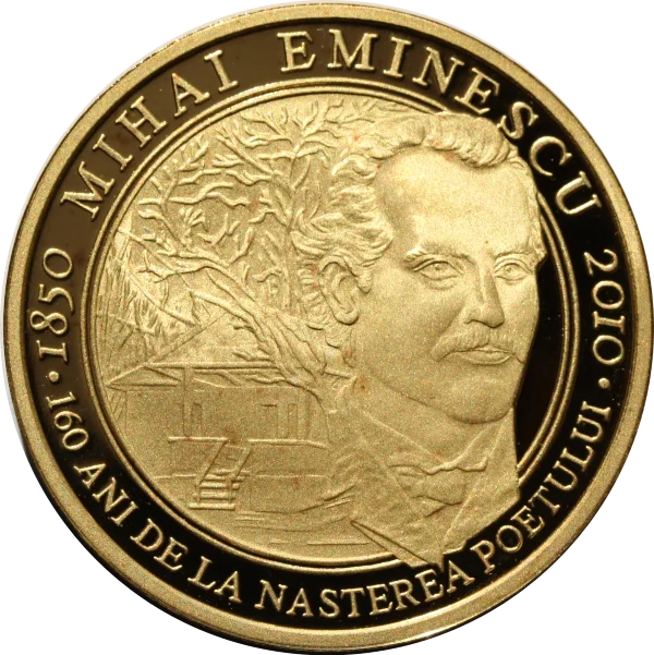 The center features the Ipoteşti memorial house, Eminescu's childhood home, and his 1885 portrait within a double circle. "MIHAI EMINESCU" arcs above, with "160 ANI DE LA NASTEREA POETULUI" below. The years "1850" and "2010" are on the left and right, respectively.