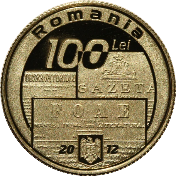 A composition featuring George Bariţiu's publication titles, the arched inscription "Romania", the face value "100 Lei", Romania's coat of arms, and the issue year "2012" on both sides.