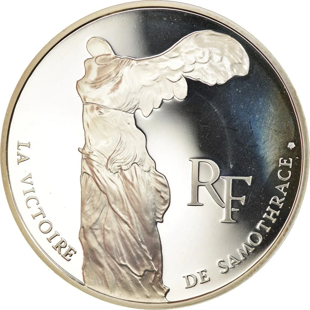"RF" and "THE VICTORY OF SAMOTHRACE" around the statue of the Greek goddess Athena Nike, discovered on Samothrace in 1863.