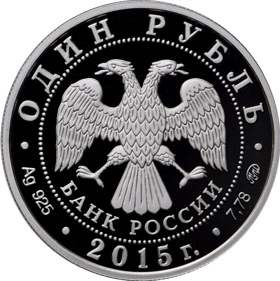 The central Bank of Russia emblem is encircled by dots. The rim inscriptions read "ONE ROUBLE" above, and below: the metal/fineness on the left, "2015" in the center, and the metal content/mint mark on the right.