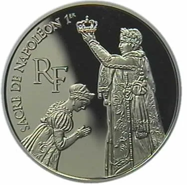 "SACRE DE NAPOLÉON 1er" encircles Napoleon crowning Josephine, after David's painting, with "RF" at left.
