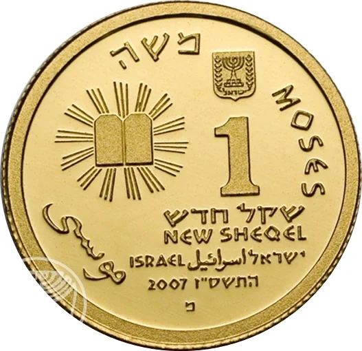 Face value in Hebrew and English, Israel State Emblem, "Israel" in trilingual text, mint year; left, a decorative Tablets of the Law with a radiant glow, "MOSES" inscribed along the border in Hebrew, English, and Arabic.