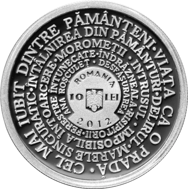 Concentric layout of Marin Preda's major works; center features Romania's coat of arms, "10 LEI", "ROMANIA", and "2012".