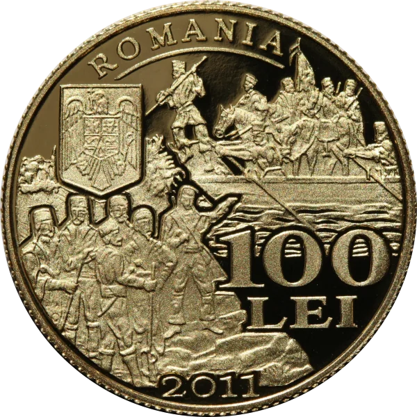 Tudor Vladimirescu’s Pandurs crossing the Olt River, with “ROMANIA” arched above, the Romanian coat of arms, face value “100 LEI,” and issue year “2011.”