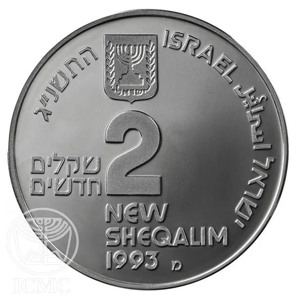 Silver B.U. coin: 1 New Sheqel. Silver Proof coin: 2 New Sheqalim. Gold coin: 10 New Sheqalim. Below the face value is the year 1993. Above is the State Emblem, with the Hebrew year 5753 to its left and "ISRAEL" in Hebrew, Arabic, and English to its right.