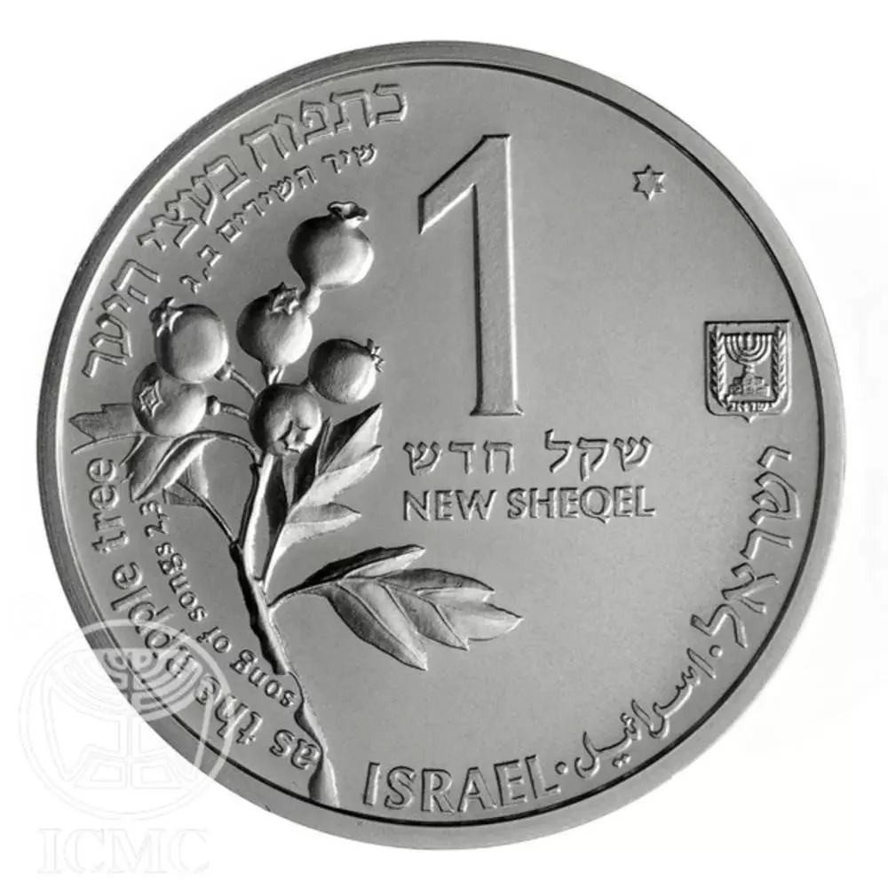 Description: Face value in Hebrew and English: 1 New Sheqel on the silver B.U. and 18mm gold coin; 2 New Sheqalim on the silver proof; 5 New Sheqalim on the 22mm gold coin. The design features the State emblem, a hawthorn branch (representing the biblical apple tree) with fruit, and "ISRAEL" in Hebrew, Arabic, and English. The circumference bears the quote "as the apple tree" and its source "Song of Songs 2:3" in Hebrew and English.