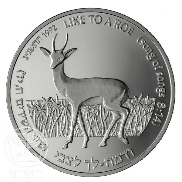 Description: Face value in Hebrew and English: 1 New Sheqel on the silver B.U. and 18mm gold coin; 2 New Sheqalim on the silver proof; 5 New Sheqalim on the 22mm gold coin. To the right of the value is the Israel State Emblem, to the left a Lily of the Valleys. "ISRAEL" appears in Hebrew, Arabic, and English with the quote "lily of the valleys" and its source "Song of Songs 2:1" in Hebrew and English.
