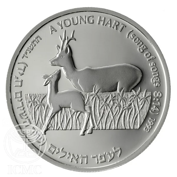 Description: Face value in Hebrew and English: 1 New Sheqel on the silver B.U. and 18mm gold coin; 2 New Sheqalim on the silver proof; 5 New Sheqalim on the 22mm gold coin. Features the State Emblem and a hawthorne branch (representing the biblical apple tree) with fruit, plus "ISRAEL" in Hebrew, Arabic, and English. The circumference bears the quote "as the apple tree" and its source "Song of Songs 2:3" in Hebrew and English.