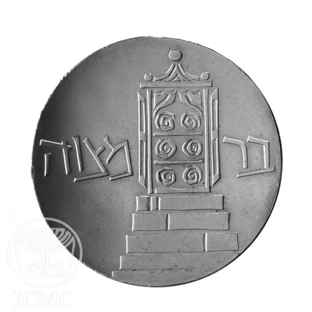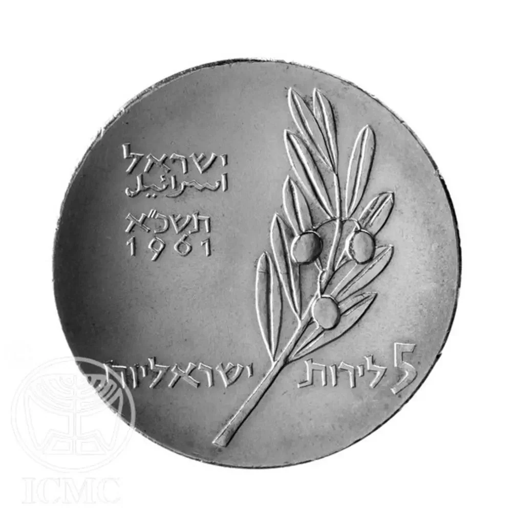 An olive branch with ten leaves and three olives (13 total) symbolizing Bar Mitzvah and Israel's 13 years of statehood. Inscribed with "Israel" in Hebrew and Arabic, dated 1961/5721.