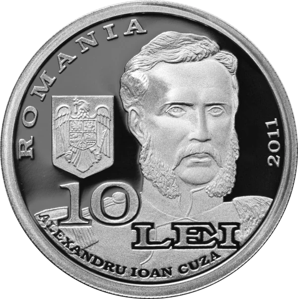 A portrait of Alexandru Ioan Cuza, his name, "ROMANIA," Romania's coat of arms, the face value "10 LEI," and the issue year "2011."