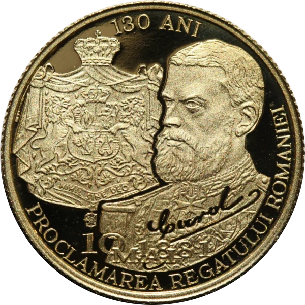 The 1881 Romanian coat of arms and a portrait of King Carol I, overlaid with "10 MAI 1881" and his signature; on the rim, "130 ANI" and "PROCLAMAREA REGATULUI ROMANIEI" in an arc.