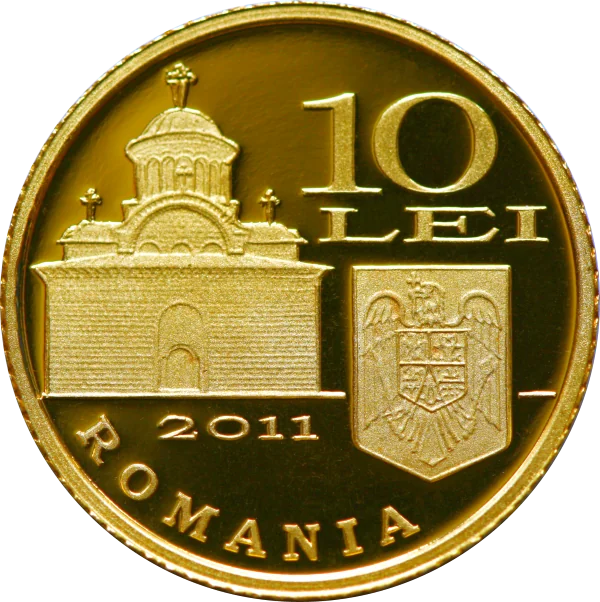 The Princely Church in Curtea de Argeş; the coin's face value "10 LEI" and Romania's coat of arms; below, the year "2011" and the arched inscription "ROMANIA".