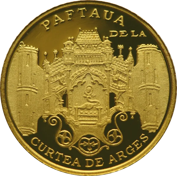 Center: buckle reproduction. Rim: “PAFTAUA DE LA CURTEA DE ARGES” inscription.