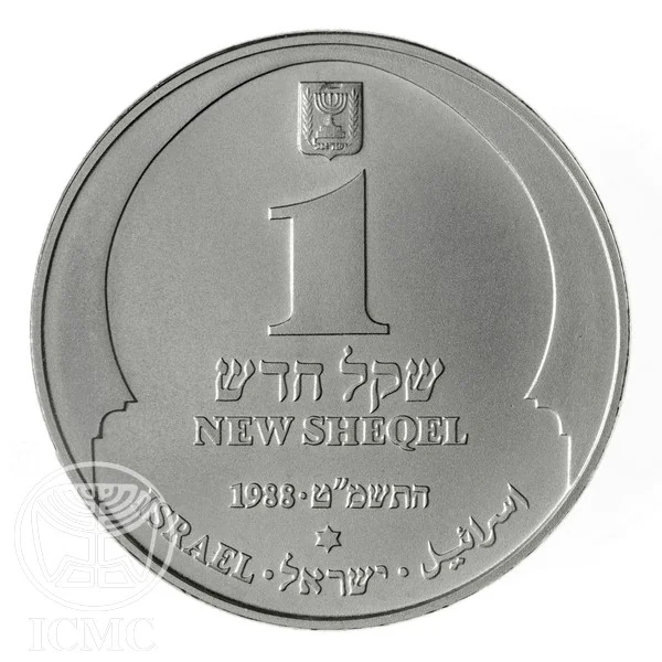 "1 New Sheqel" in Hebrew and English, Israel's emblem, 1988/5749 mint year, and "ISRAEL" in Hebrew, English, and Arabic.
