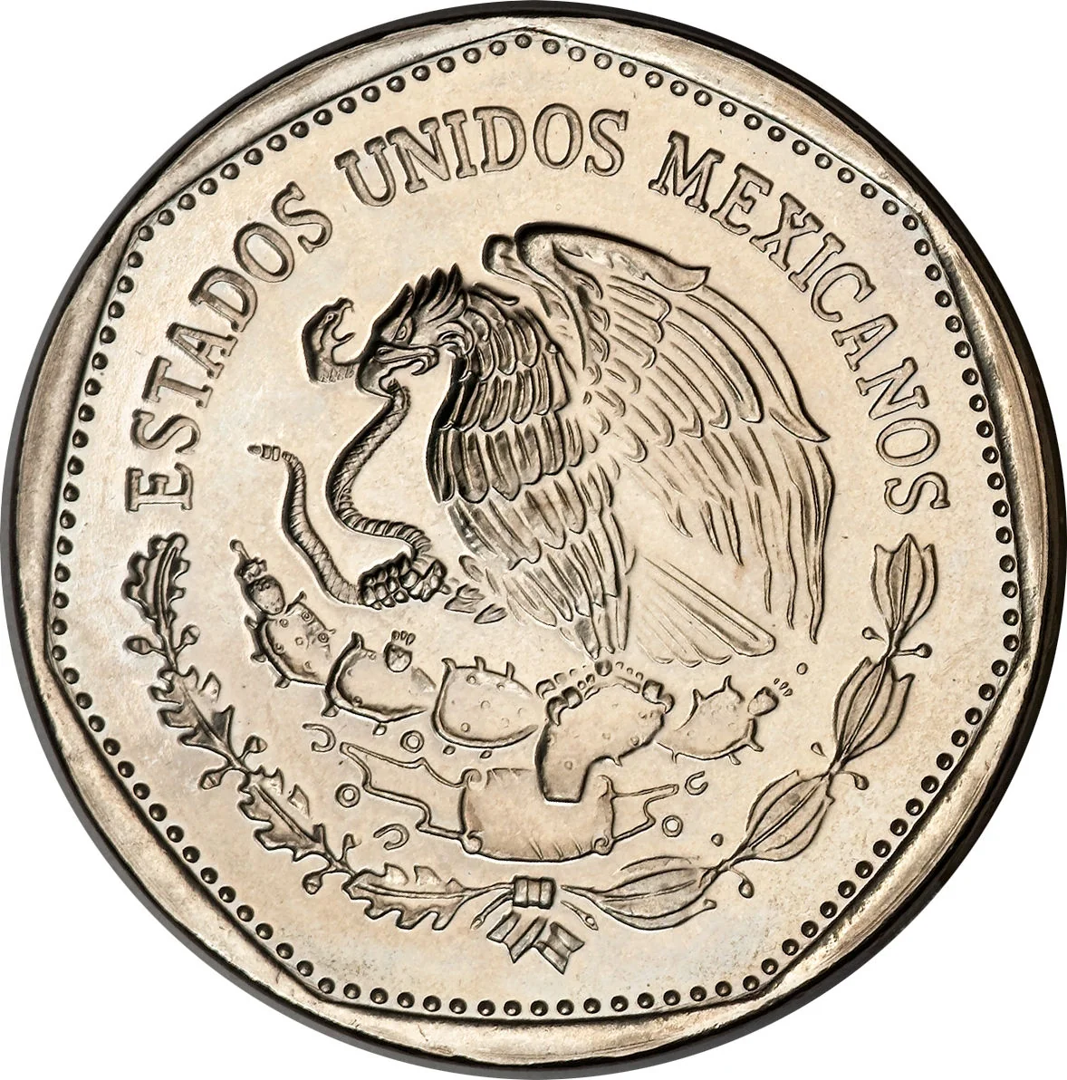 Quetzalcoatl sculpture left of "$" and "PESO," date beneath.