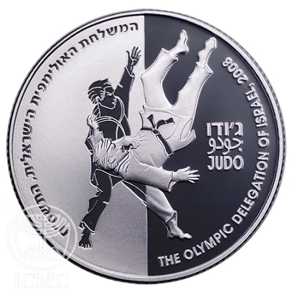Face value in Hebrew and English, Israel's emblem, "Israel" in three languages, mint year, and a decorative Judo belt element symbolizing skill levels.