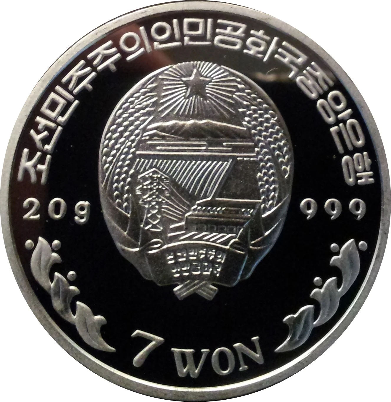 North Korean State Arms with '20g' left, '999' right, Korean inscription above. Stylized waves below flank '7 Won'.
