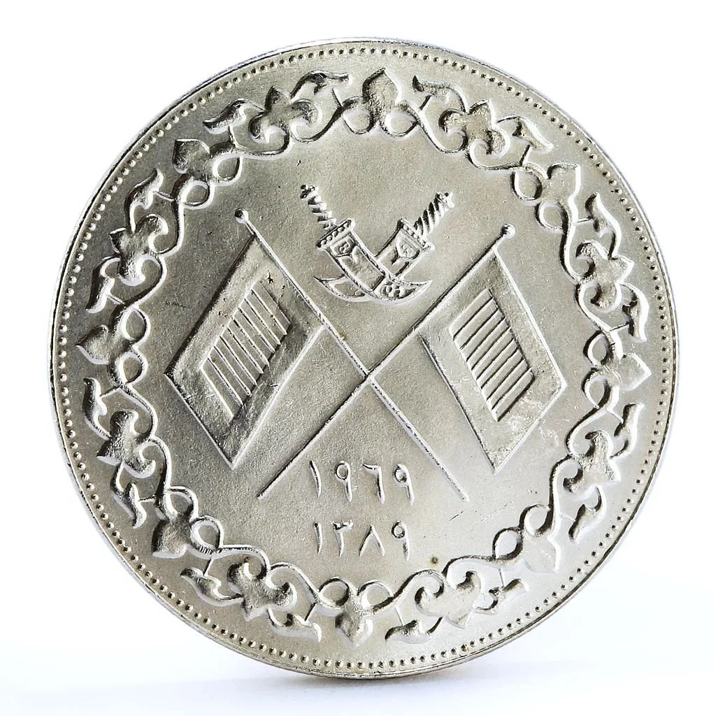 State emblem: crossed khanjar daggers between two flags on crossed poles, with dates, enclosed in a wreath.