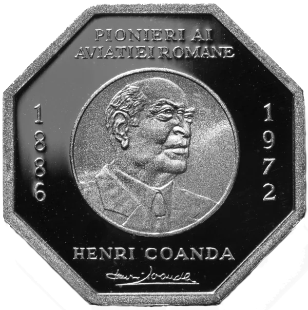 Portrait of inventor Henri Coandă (1886–1972). Above: "PIONIERI AI AVIATIEI ROMANE". Below: "HENRI COANDA" and his facsimile signature.