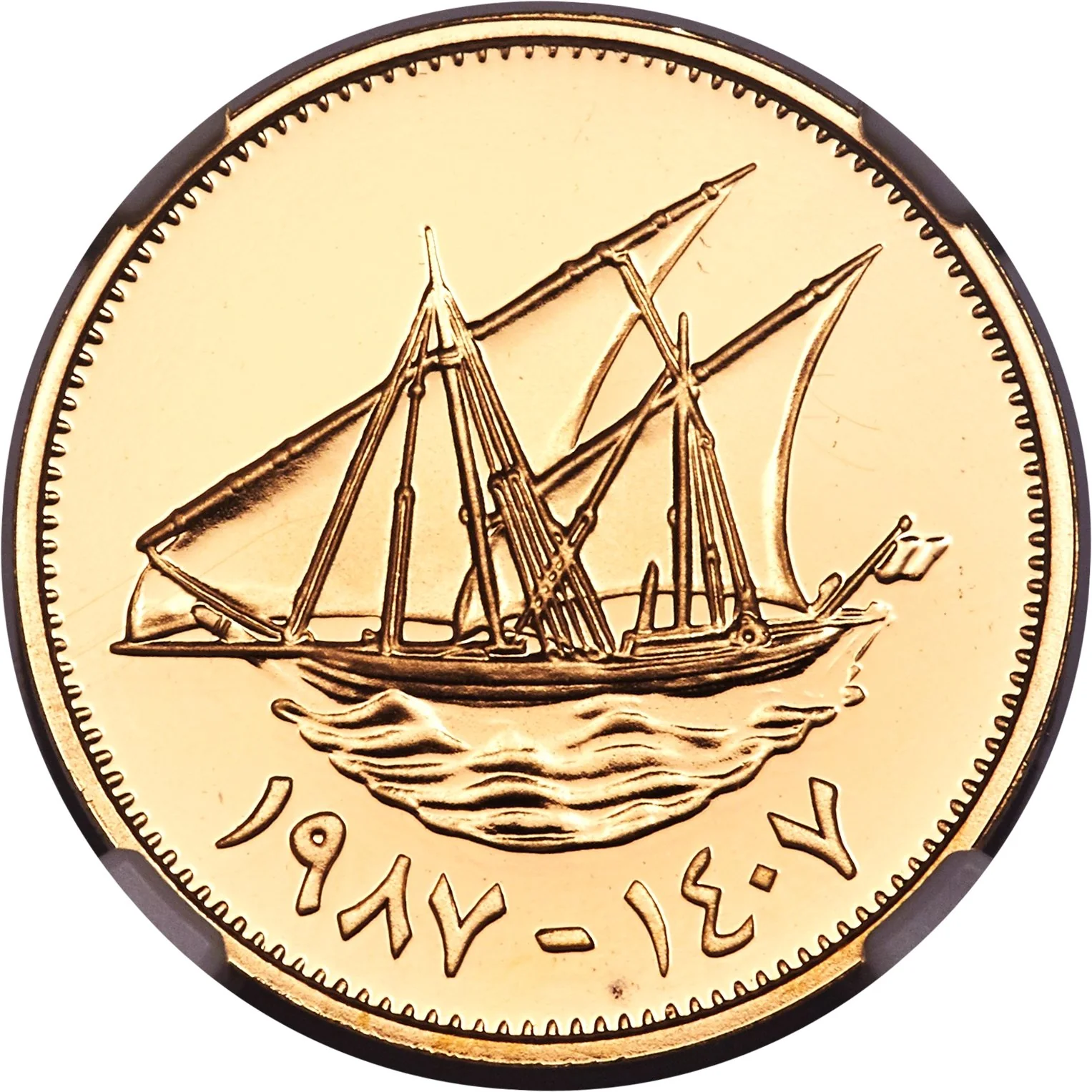 Boom dhow sailing left, small flag on right. Arabic dates below.