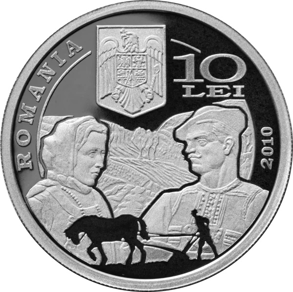 A graphic inspired by Rebreanu's "Ion," featuring "ROMANIA" in an arc, the national coat of arms, "10 LEI," and "2010."
