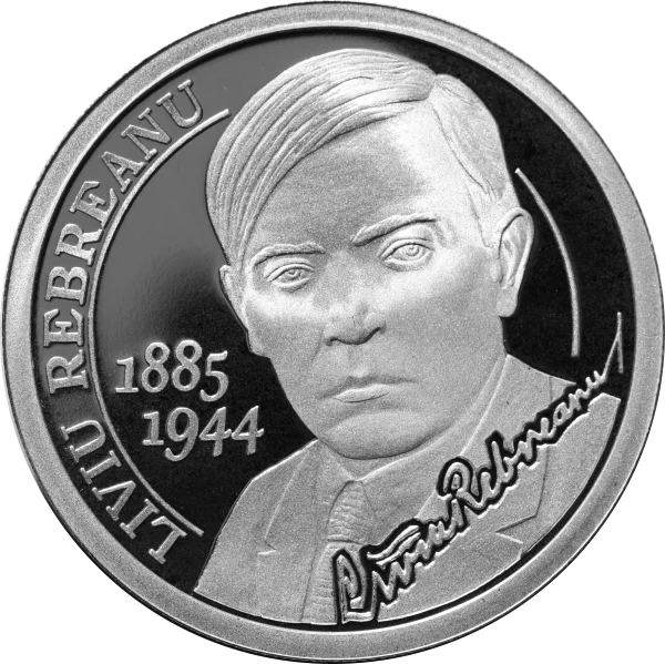 Liviu Rebreanu's portrait overlaps a circle. To the left are his years "1885-1944" and his name in an arc; to the lower right is his signature.