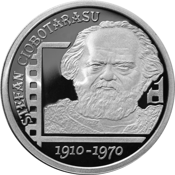 Portrait of actor Ştefan Ciobotăraşu in "Columna." Around the left edge, the arched inscription "STEFAN CIOBOTARASU" with his life years "1910" and "1970" below.