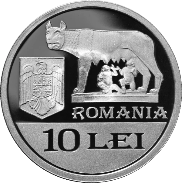 Featuring the Lupa capitolina, Romania's coat of arms, the inscription "ROMANIA", and the face value "10 LEI".