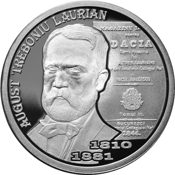 Portrait of August Treboniu Laurian in the foreground. Background right: a fragment of "Magazin istoric pentru Dacia." Below: the years 1810 and 1881. Circular inscription: "AUGUST TREBONIU LAURIAN" on the outer ring.