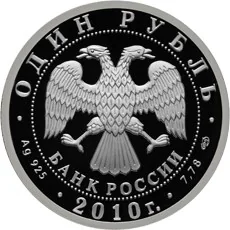 Center: Bank of Russia emblem (two-headed eagle, wings down, with "БАНК РОССИИ" below), circled by dots. Rim inscriptions: top - "ОДИН РУБЛЬ"; bottom - metal/fineness on left, "2010 г." in center, metal content/mint mark on right.