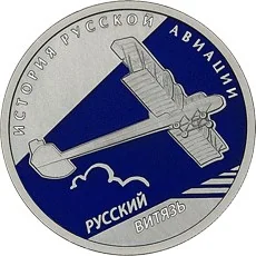 A biplane on a colored disc, with "РУССКИЙ ВИТЯЗЬ" below and "ИСТОРИЯ РУССКОЙ АВИАЦИИ" along the top rim.