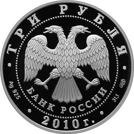 Center: Bank of Russia emblem (two-headed eagle, wings down, with "БАНК РОССИИ" below), within a dotted circle. Rim inscriptions: top - "ТРИ РУБЛЯ"; bottom left - metal and fineness; center - "2010 г."; bottom right - metal content and mint mark.
