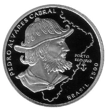 Portrait of PA Cabral, leader of the 1500 Lisbon-Brazil-India voyage. A map at right shows the Brazilian coast and Porto Seguro Bay, where the fleet stopped.