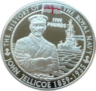 Portrait of John Jellicoe, arms folded, with a warship and a colored flag behind him.