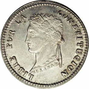 Bolivar head right, motto around, name on truncation.
