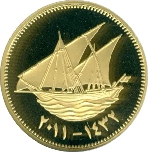 Boom dhow sailing left, small flag on right. Arabic dates below.