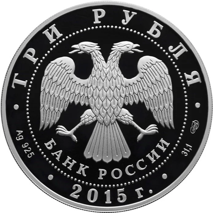 Center: Bank of Russia emblem (two-headed eagle, "БАНК РОССИИ"), circled by dots. Rim inscriptions: top – "ТРИ РУБЛЯ"; bottom left – metal and fineness; center – "2015 г."; bottom right – metal content and mint mark.