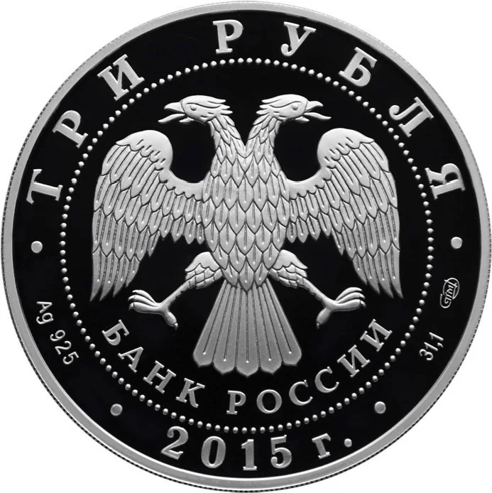 Center: Bank of Russia emblem (two-headed eagle, "БАНК РОССИИ"), circled by dots. Rim inscriptions: top – "ТРИ РУБЛЯ"; bottom left – metal and fineness; center – "2015 г."; bottom right – metal content and mint mark.