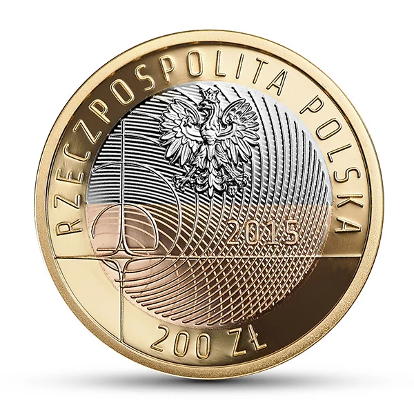 Central field: Poland's national eagle. Below: m/w mint mark. Right: 2015. Background: fractal pattern. Rim: RZECZPOSPOLITA POLSKA and 200 ZŁ.