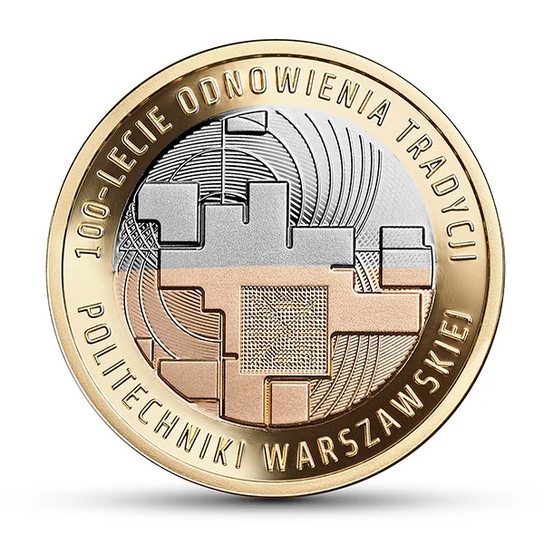 Central field: artistic visualization of physical and mathematical forms, featuring a square with a latent image. Tilt to see Σ, a gearwheel, or ⋇. Outer ring inscription: 100-LECIE ODNOWIENIA TRADYCJI POLITECHNIKI WARSZAWSKIEJ.