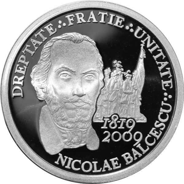 Left foreground: Nicolae Bălcescu's effigy (after Tattarescu). Right background: 1848 revolutionaries (after Costache Petrescu), partly obscured, with the years "1819" and "2009". The outer ring bears "DREPTATE FRATIE UNITATE" above and "NICOLAE BALCESCU" below.