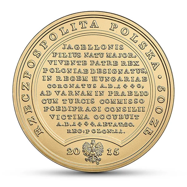 JAGELLONIS FILIUS NATU MAJOR, VIVENTE PATRE REX POLONIAE DESIGNATUS, IN REGEM HUNGARIAE CORONATUS A.D.I 440, AD VARNAM IN PRAELIO CUM TURCIS COMMISSO FOEDIFR AGI CONSILII VICTIMA OCCUBUIT A.D.I 444. AETAT:20. REG:POLON:II.