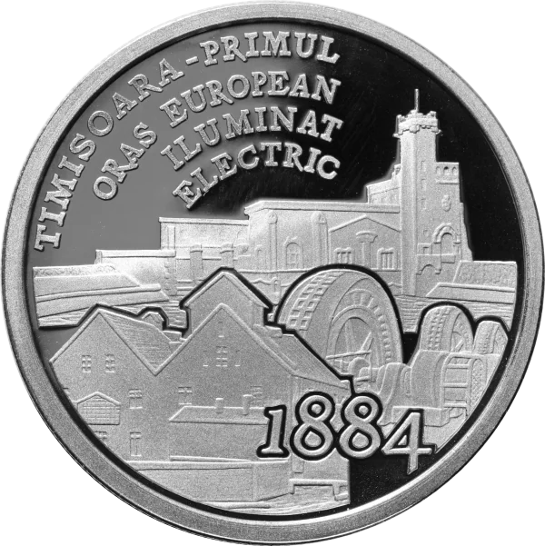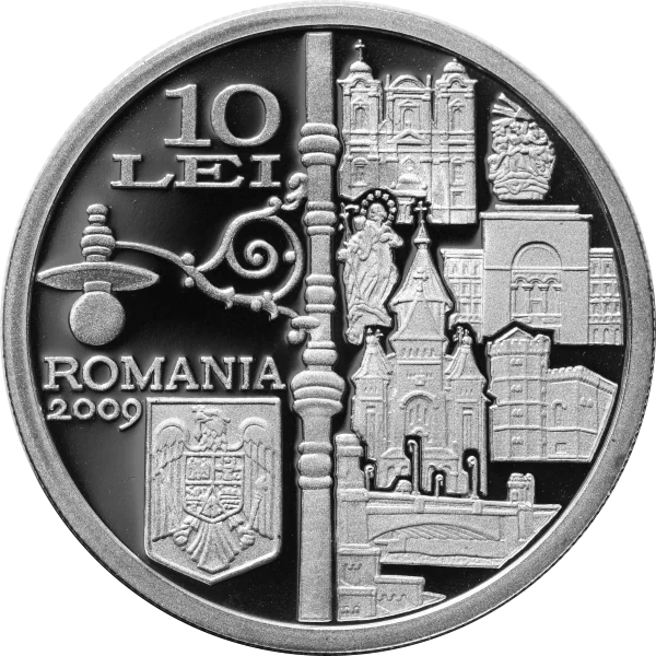Description: Left: 10 LEI face value, a vintage street lamp, "ROMANIA", 2009, and Romania's coat of arms. Right: Timişoara landmarks: the Roman-Catholic Dome, part of the Holy Trinity monument, a Virgin Mary statue, the Romanian Opera, the Orthodox Cathedral, the Banat Museum, and the "Mitropolit Şaguna" bridge over the Bega river.