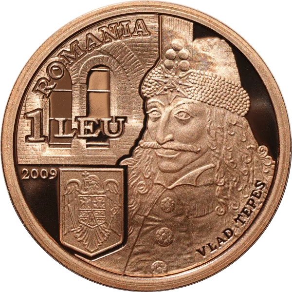 Description: The portrait of Vlad Ţepeş is in the foreground, with "VLAD TEPES" inscribed below. To the left is a window from the Old Princely Court, with Romania's coat-of-arms beneath it. Around the outside, "ROMANIA" is above, and "1 LEU" with the year 2009 are below.