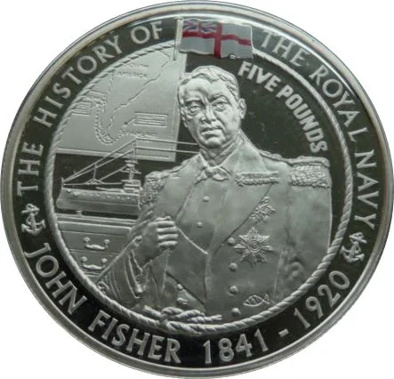 Portrait of Sir John Fisher with a map, model ship, and a colored flag.