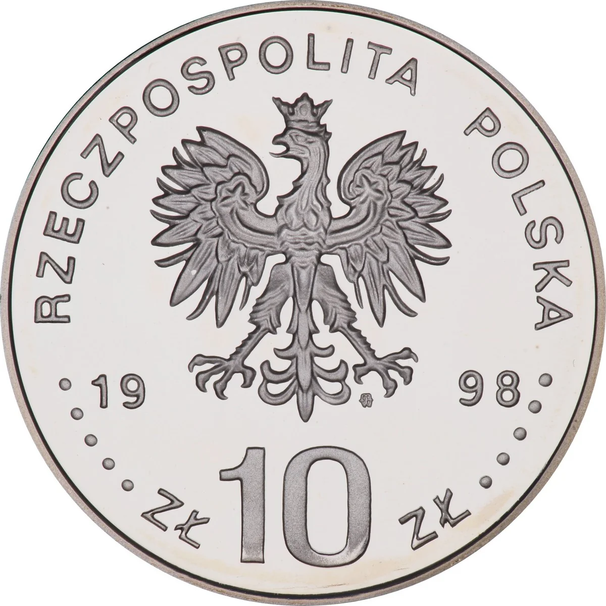 Polish Republic eagle emblem, year 19-98, inscription ZŁ 10 ZŁ below. Edge: RZECZPOSPOLITA POLSKA (REPUBLIC OF POLAND) with five beads before and after. Mint mark M/W under eagle's left talon.