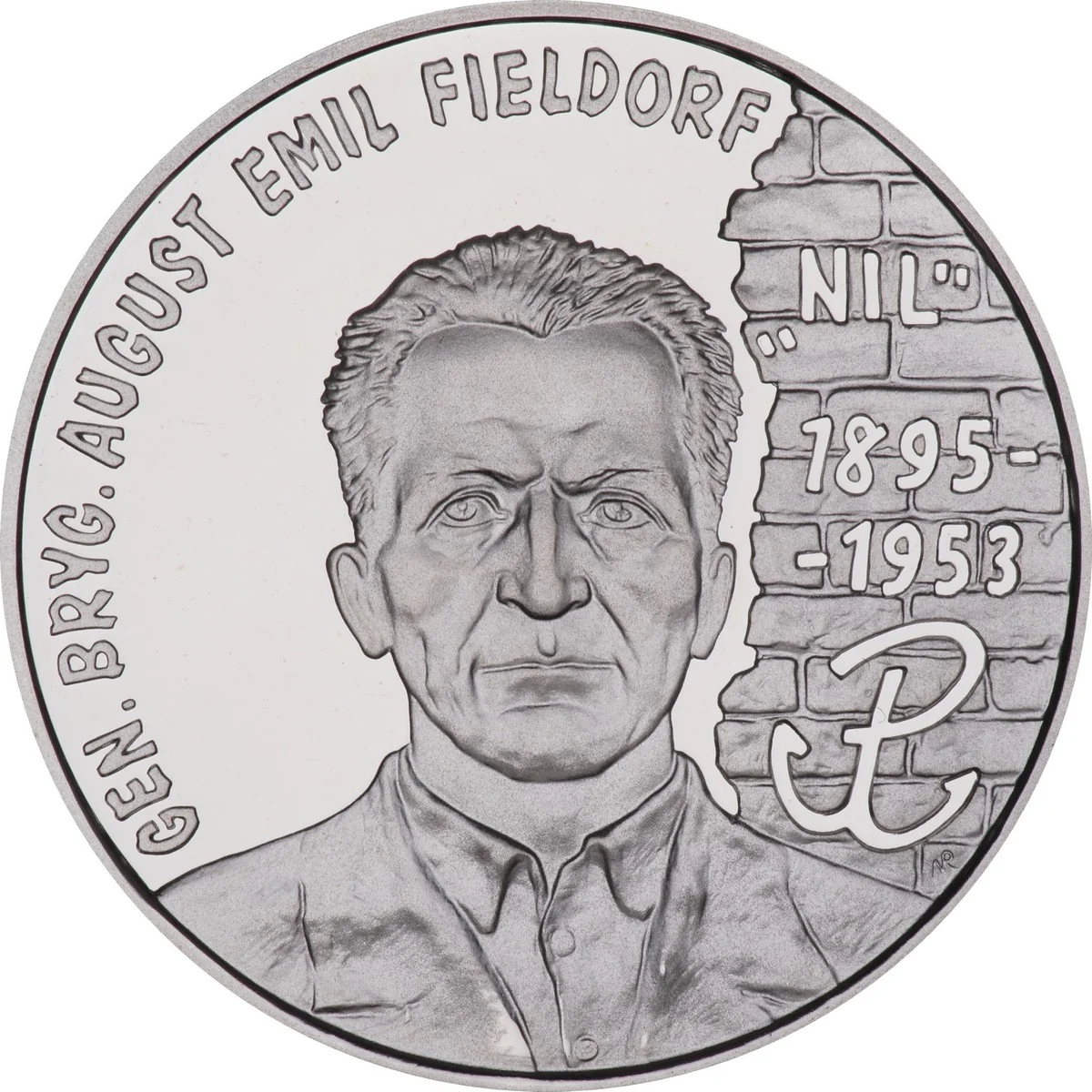 Portrait of August Emil Fieldorf. Left: semicircular inscription "GEN. BRIG. Emil August Fieldorf". Right: stylized wall fragment with "NIL / 1895 - / - 1953" and an anchor—symbol of Polish resistance.