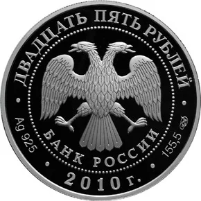 Central emblem: Bank of Russia's two-headed eagle, with "БАНК РОССИИ" below, inside a dotted circle. Rim inscription: "ДВАДЦАТЬ ПЯТЬ РУБЛЕЙ" above. Below rim left: metal and fineness; centre: "2010 г."; right: metal content and mint mark.