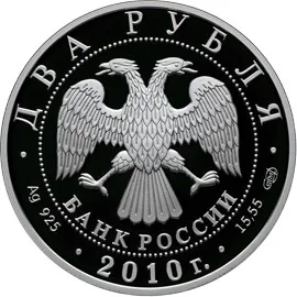 Center: Bank of Russia emblem (two-headed eagle, wings down, with "БАНК РОССИИ" below), within a dotted circle. Rim inscriptions: top - "ДВА РУБЛЯ"; bottom left - metal and fineness; center - "2010 г."; bottom right - metal content and mint mark.
